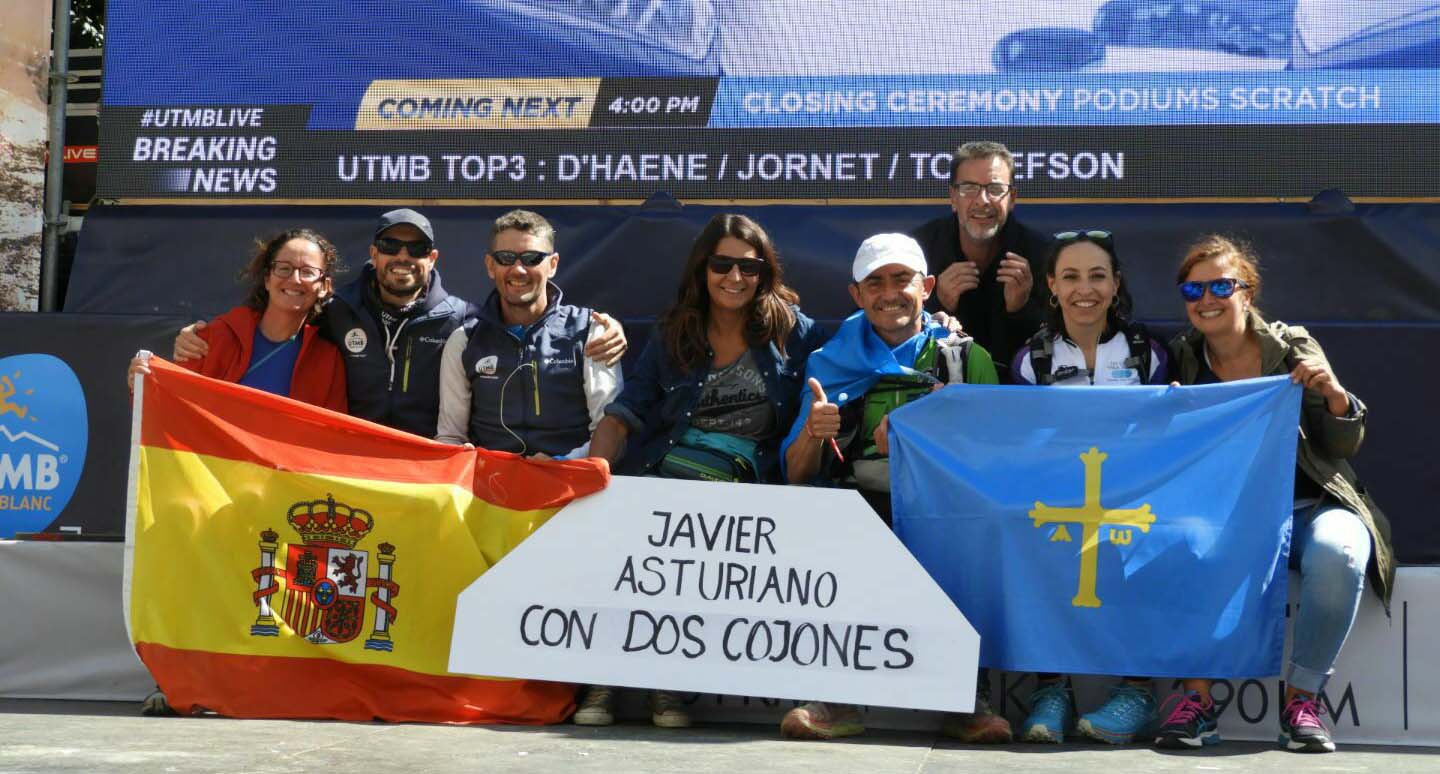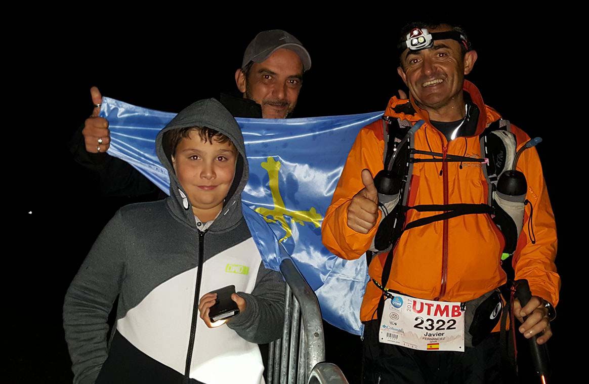 El ganador en la Ultra Trail del Mont Blanc fue el francés François D'Hoene, que hizo los 171 kilómetros en decienueve horas, un minuto y cincuenta y cuatro segundos. El primer español, muy conocidos por todos, fue Kilian Jornet, que hizo 19h16'59 y terminó segundo. Y en el puesto 1214 llegaba un asturiano con dos banderas de Asturias, una que llevaba en la espalda y otra que sujetaba por delante, Javier Fernández, dorsal número 2322, que hizo cuarenta y tres horas, veinte minutos, cuarenta y ocho segundos, ocupando el puesto 148 de su categoría, la V2H, que va de los 50 a los 59 años. Javier ¿cómo se puede estar 43h20' corriendo? ¿Para tí era la primera vez en el Mont Blanc?