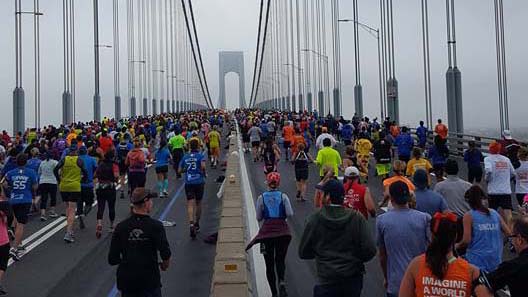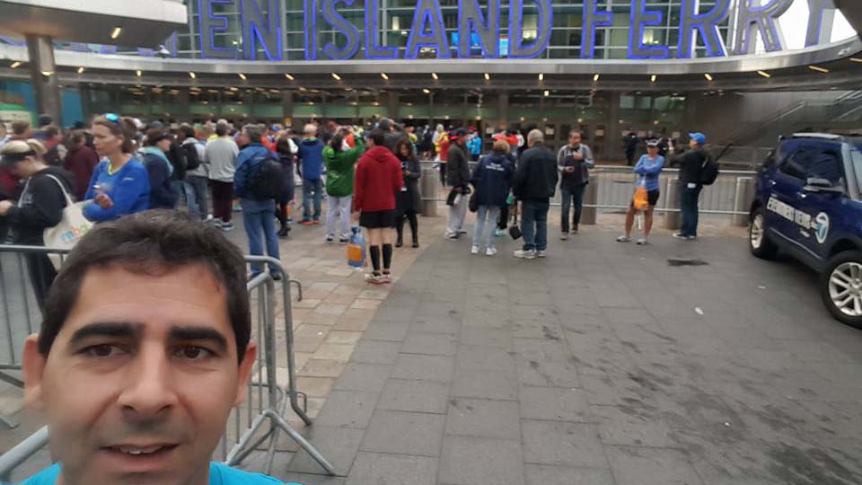 Yo creo que la cantidad de gente, la cantidad de gente corriendo y cómo está organizada. Porque ten en cuenta que llegados este año fueron más de cincuenta mil personas, pero tienes que mover cincuenta mil personas desde dónde estén. Desde Manhattan normalmente, o desde New Jersey, mover esas cincuenta mil personas hasta la salida, con lo cual es mover casi una pequeña ciudad, y la tienes que mover en cinco horas y llevarla a la salida, y es brutal cómo lo hacen. Nunca estás parado, no está nada bloqueado, y es hora y media para llegar hasta allí, con lo cual empiezan a las cinco y media de la mañana a llevar gente. Yo fui en ferry, lo primero que tienes que hacer es llegar en metro hasta el puerto, ahí coger un ferry, llegas al ferry y salir de la estación del puerto dónde estás es otra media hora caminando, nunca estás parado, y luego coger un autobús hasta la salida.