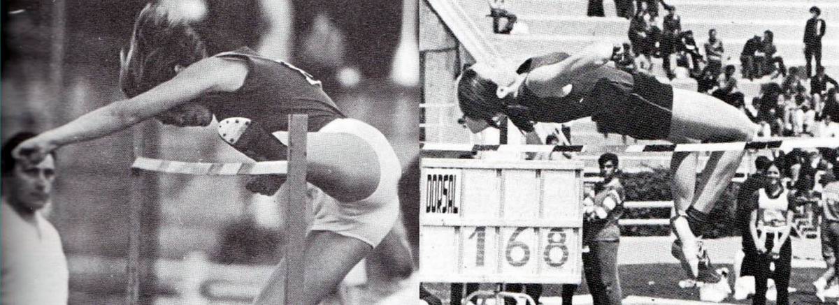 Más que complicado ¡me hubiera quedado parapléjica! (risas) Entonces vamos avanzando un poquito más y ya ponían unos sacos de goma espuma, en los que era un poquito mejor la caída que con la tierra. Pero cuando te caías en la juntura de los sacos pues tampoco era muy agradable, así que yo seguí saltando ‘rodillo’. Y a raíz de los Juegos del 68, es cuando llega Fosbury y nos sorprende a todos, porque era un estilo que nunca se había saltado así y que, como nunca lo habían hecho antes, lo tuvieron que aprobar. Eso le paso a De la Cuadra Salcedo, con la jabalina, que no se lo homologaron, y a Fosbury se lo tuvieron que homologar. Así que, a la vuelta de esos Juegos, yo que tenía un entrenador muy lanzado, muy loco y muy bueno (Bernardino Lombao) pues empezamos a saltar Fosbury… como Dios nos dio a entender, porque tampoco es que fuese muy técnico cómo lo hacíamos. Cómo no había fosos empezamos a entrenar en la piscina universitaria. Allí montábamos unos números tremendos, poníamos de listón una toalla y de foso hacía el agua… y yo saltaba y caía al agua.